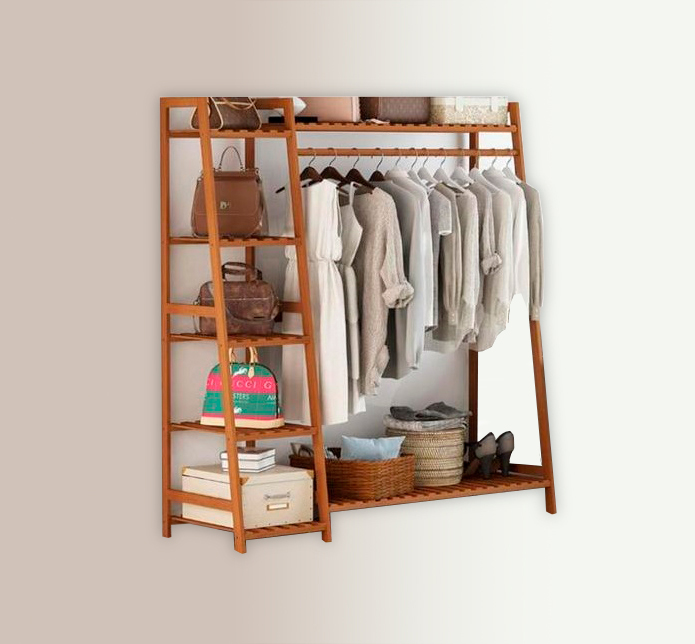 La forma rectangular permite maximizar el espacio, con una barra superior para colgar prendas y estantes inferiores para organizar ropa doblada y otros artículos. Los estantes son amplios y permiten almacenar diferentes tipos de objetos, como zapatos, cajas y ropa doblada, lo que ayuda a mantener el orden.