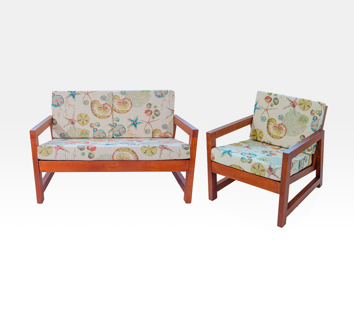 Por su parte, el sillón individual mantiene un diseño similar, con una estructura de madera que sigue las mismas líneas y proporciones que el sofá. Esto permite que ambos muebles formen un conjunto armónico y coherente en su aspecto visual.